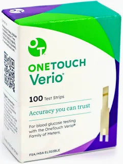 One Touch Verio glucose test strips are designed to require a very small amount of blood to produce an accurate reading. Compatible with the OneTouch Verio, OneTouch Verio IQ and OneTouch VerioSync meters. 100 total test strips per order (may arrive in one box of 100, two boxes of 50 or four boxes of 25 each, always in-date and factory-sealed).
